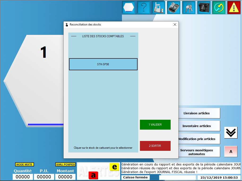 Cliquer sur l'icône pompe puis la touche réconciliation ou utiliser le raccourci caisse -1 et valider.