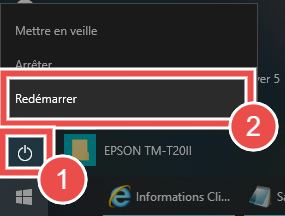 Cliquez l'icone "POWER" (1) puis sur "Redémarrer" (2).