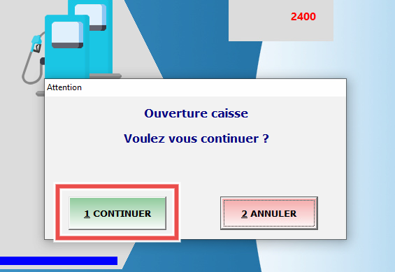 Sélectionner "ouverture caisse", puis "Continuer", saisir le code caissier et "Valider".
