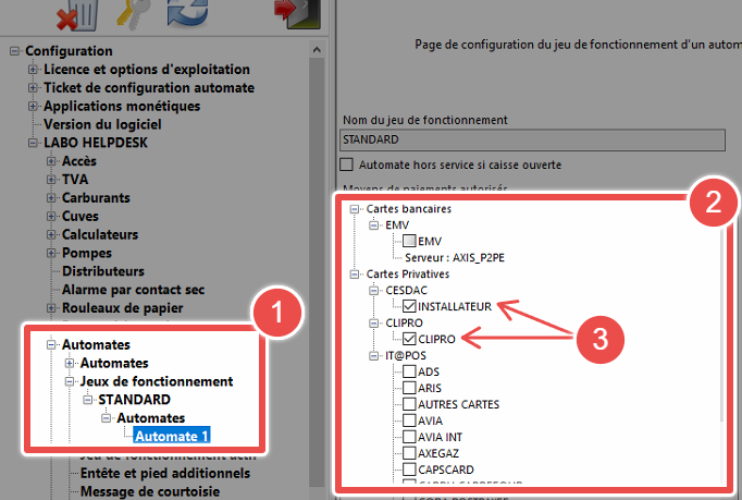 Cliquer sur "Automates", "Jeux de fonctionnement", "STANDARD", "Automates", puis sélectionner l'automate sur lequel la modification des moyens de paiement est souhaitée. (1)